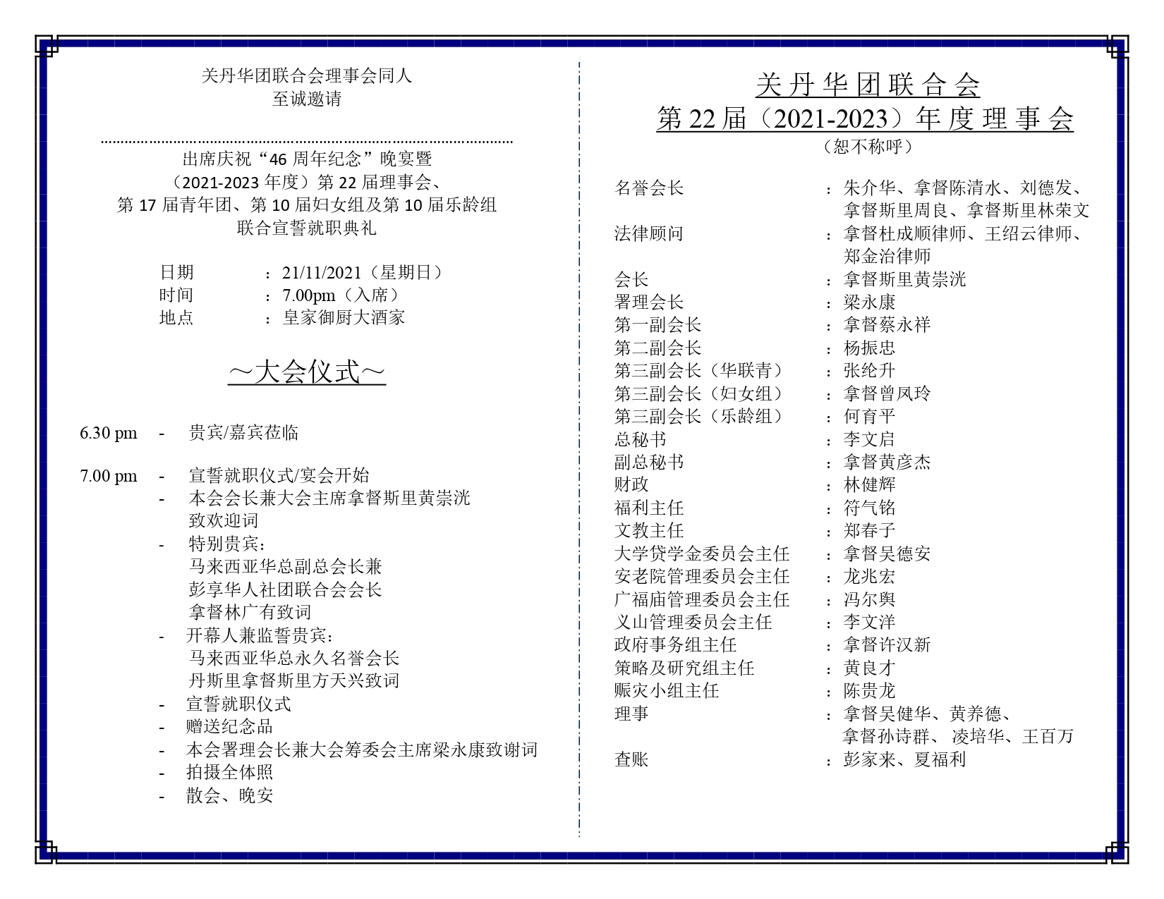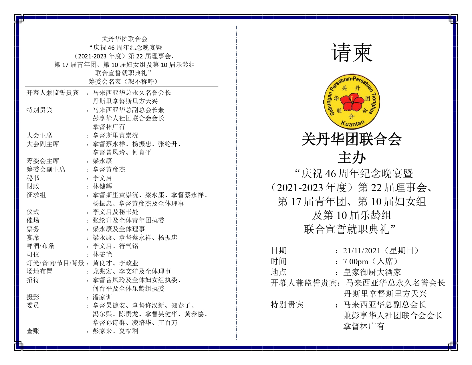 林进丁, 曾文明代表出席关丹华团联合会庆祝“46周年纪念晚宴暨(2021-2023年度)第 22届理事会、第17届青年团、第10届妇女组及第10届乐龄组联合宣誓就职典礼”